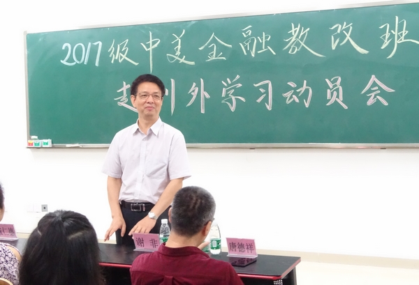 动员会上,谢院长首先对通过学校严密选拔、考核录取的40名同学表示欢迎,并对赴四川外国语大学进行为期1年的培养和学习进行了总体介绍和安排。他谈到,赴四川外国语大学进行为期1年的学习是中美金融学“1+2+1”教改班项目的人才培养特色,也是我市高校校际合作的标杆。